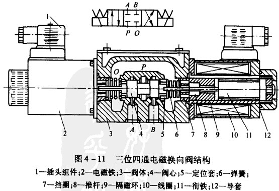圖4-12所示為二位四通電磁閥的符號(hào),圖4-12(8)為單電磁鐵彈簧復(fù)位式.圖4-12(b)為雙電磁鐵銅球定位式。二位電磁閥.一般都是單電磁鐵控制的,但無(wú)復(fù)位彈簧雙電磁鐵二位閥,由于電磁鐵斷電后仍能保留通電時(shí)的狀態(tài),從而減少了電磁鐵的通電時(shí)閥,延長(zhǎng)了電磁鐵的壽命,節(jié)約了能源;此外,當(dāng)電磁鐵因故中斷時(shí),電磁閥的工作狀態(tài)仍能保留下來(lái),可以避免系統(tǒng)失靈或出現(xiàn)事故。