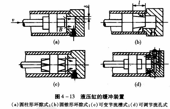 (1)圓柱形環(huán)隙式緩沖裝置:如圖4-13(a)所示。當(dāng)緩沖柱塞進(jìn)入缸蓋內(nèi)孔時(shí),被封閉的油必須通過(guò)間隙才能排出,從而增大了回油阻力,使活塞速度降低。這種結(jié)構(gòu)因節(jié)流面積不變,所以隨活塞速度的降低,其緩沖作用也逐漸減弱。
