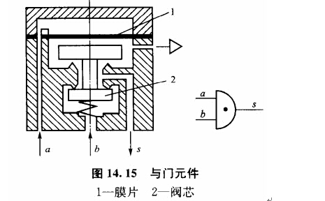 圖1 4. 15所示為與門元件的原理圖和圖形符號。從與門元件的原理圖可知,它與是門兀件相同,只是把氣源口P改為信號b。其工作原理是當(dāng)有輸入信號a,而沒有信號b時,在信號壓力U的作用下通過使膜片4變形而使閥芯2下移,輸出端s與b相連,無輸出信號;當(dāng)有輸入信號b.但沒有信號α?xí)r,閥芯2上移,輸出端也無輸出信號。只有當(dāng)輸入信號α和b同時存在,由于信號作用的有效面積不等,閥芯2下移,輸出端才有輸出信號。